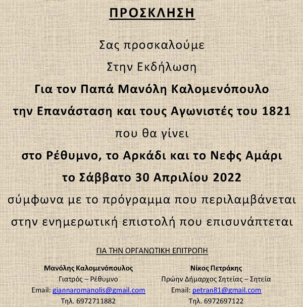 Με την επιστολή μας αυτή θέλομε να ενημερώσωμε εσάς, τους συγγενείς μας απόγονους του Παπά Μανόλη Καλομενόπουλου και τους συγγενείς μας της ευρύτερης οικογένειας των Καλομενόπουλων, ότι τον Απρίλιο του 2022 θα πραγματοποιηθεί στο Ρέθυμνο και στο Νεφς Αμάρι εκδήλωση προς τιμήν του προγόνου μας Παπά Μανόλη Καλομενόπουλου που θυσιάστηκε κατά την Επανάσταση του 1821 για την Ελευθερία, την Πίστη, την Πατρίδα μας.